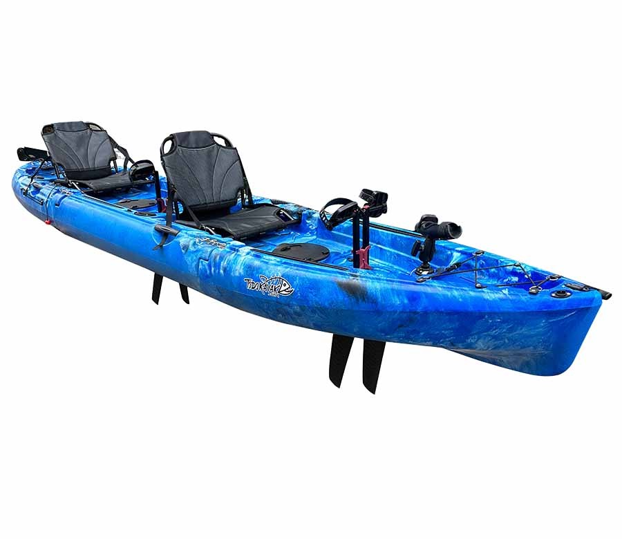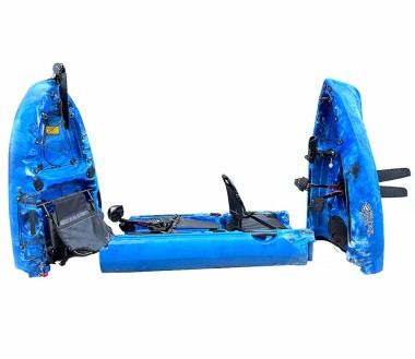El kayak modular Breca Tándem viene con una equipación se serie excepcional, sillas de aluminio, pedaleras, tambuchos, compartimentos, porta equipajes... todo para disfrutar tanto de jornadas de pesca como de paseo/deporte en el agua.
