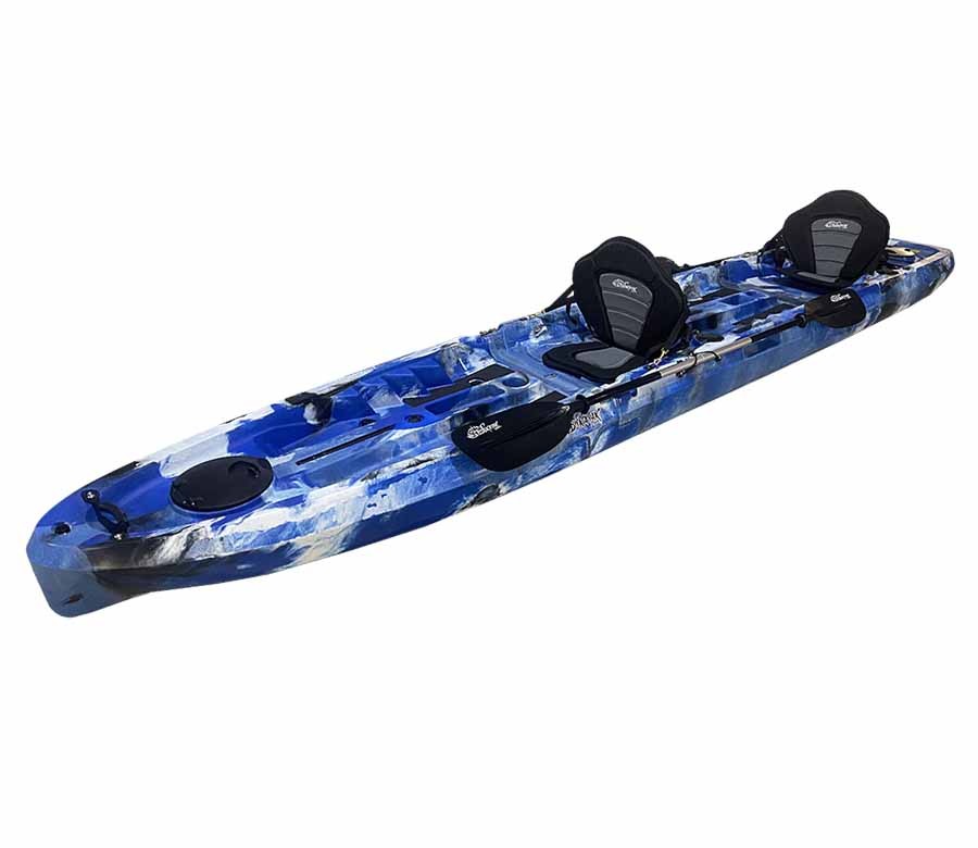 Este es el kayak desmontable de pesca familiar Luna Tándem. Perfecto para disfrutar de la pesca en familia con un kayak bien equipado de serie, compuesto por 3 módulos que suman una medida de 476x78x27 cm, pesa 46kg y soporta hasta 250 kg