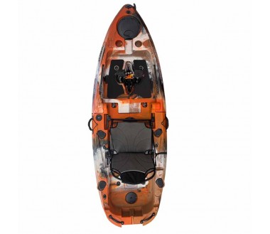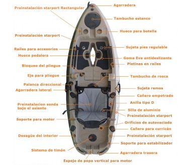 Uno de sus puntos fuertes, es la equipación de serie que trae, teniendo en cuenta el tamaño reducido del kayak. Digamos que está aprovechado hasta el último cm disponible de su cubierta. Son muchas las preinstalaciones que tiene por toda su cubierta, railes para accesorios, tambuchos, silla de aluminio regulable, pre-instalación para sonda de pesca, doble soporte en bañera trasera para estabilizadores y motor al mismo tiempo, pedalera de aletas de última generación, palanca direccional, timón y mucho más.