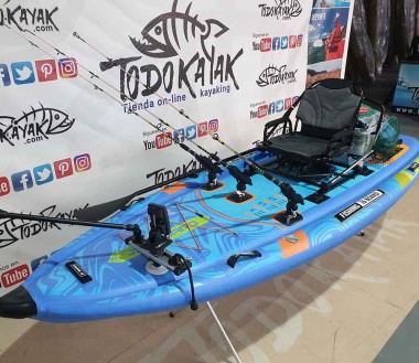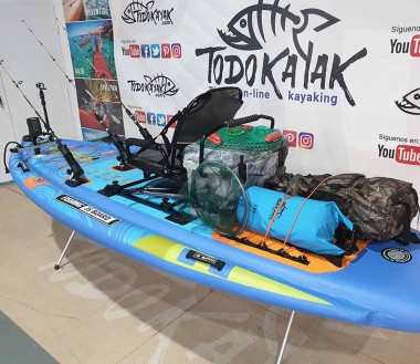 Monta 3 cámaras independientes de alta presión, el suelo y los dos flotadores laterales. Cuenta con una proa reforzada anti colisiones. Agarraderas, 3 starport con 3 cañeros giratorios de serie, silla que gira 360º, pala de remo 2 en 1 (remo kayak o pala de sup), regla de medir, etc...